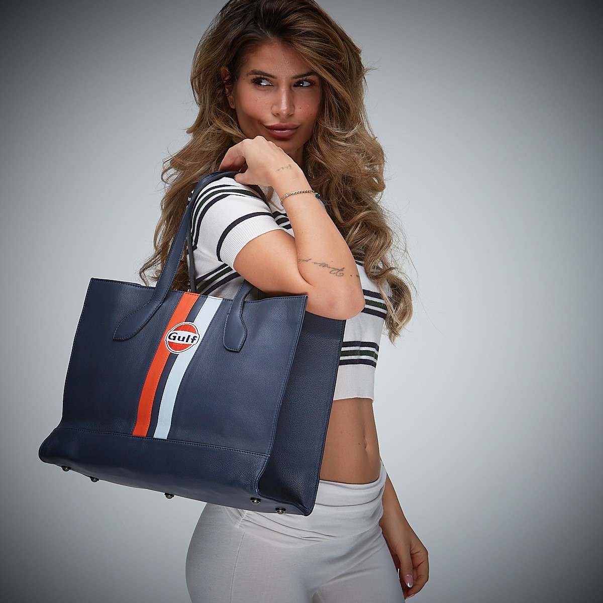 Geballtes Design aus mehrfarbigen Rindsleder trifft auf viel praktischen Stauraum für den kleinen Einkauf und alle anderen Touren. Der Gulf Leather Shopping bag sieht über der Schulter getragen genauso gut aus an den Henkeln wie in Ihren Händen. Stabiles schwarzes Innenfutter aus Baumwolle. Gibt es auch in den Farben light blue und light beige. Gleich zugreifen und bestellen, mit diesem Shopping bag im Racing Design werden Sie die schnellste sein!
