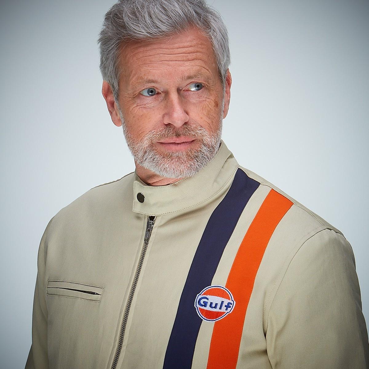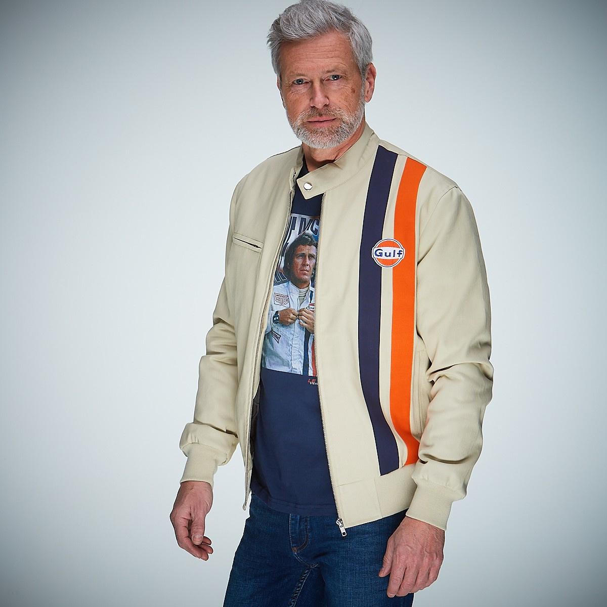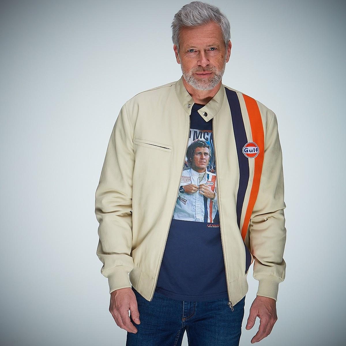 Der klassische Blouson ist abgeleitet von Steve McQueens Le Mans Rennoverall mit dem Gulf-Logo und den beiden Racingstreifen. Der Blouson fällt durch seine enge Verwandheit zum Overall entsprechend körperbetont aus. Holen Sie die Vergangenheit zurück in Ihren Kleiderschrank und begegnen Sie der Zukunft! Drive your Style!