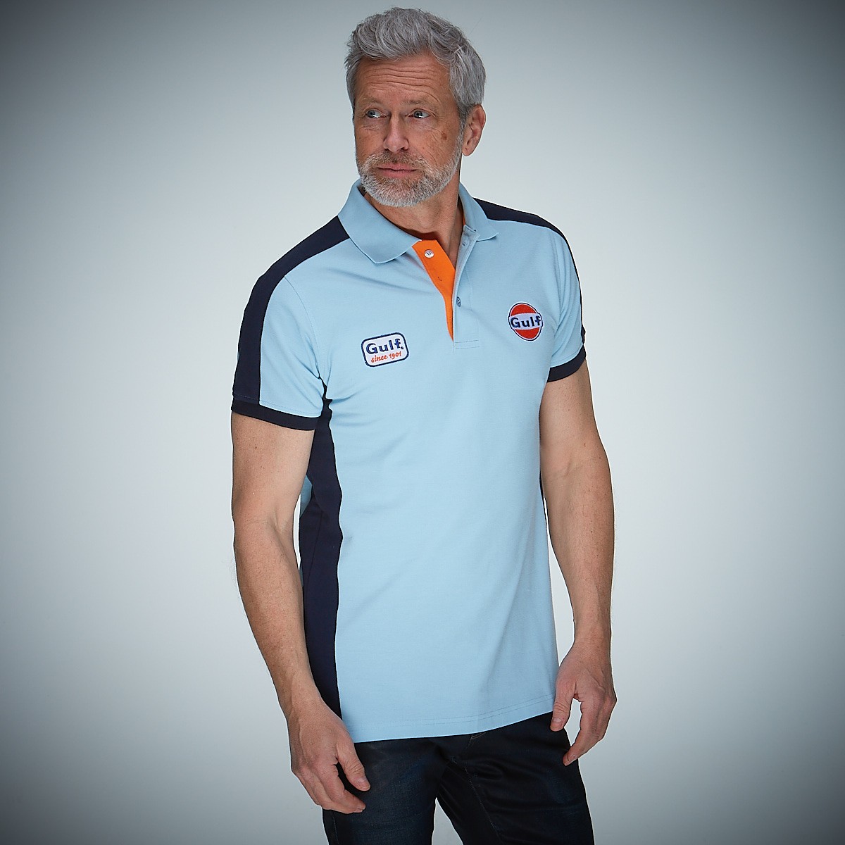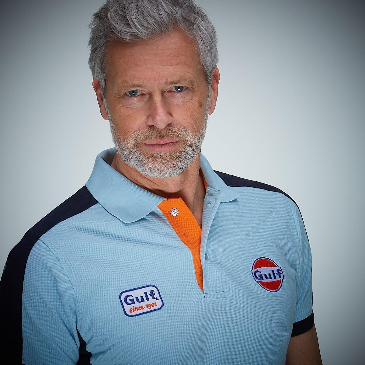 Neues Gulf Polo Shirt Design von GPO im perfekten Retrolook. Gulfblau mit marineblauen Schulter-, Seiten- und Ärmeleinsätzen. Gulf-Logo gestickt sowie „Gulf since 1901“-Abzeichen auf der Brust. Die orangefarbene Knopfleiste rundet das Design perfekt ab! Reguläre Passform und auch in Marineblau erhältlich.