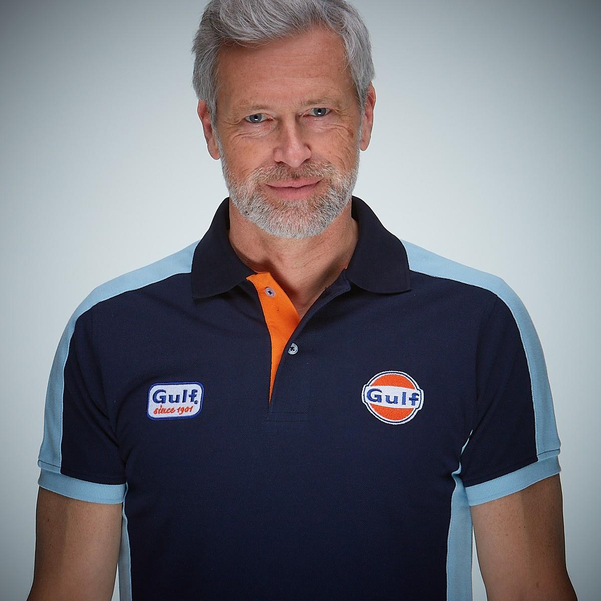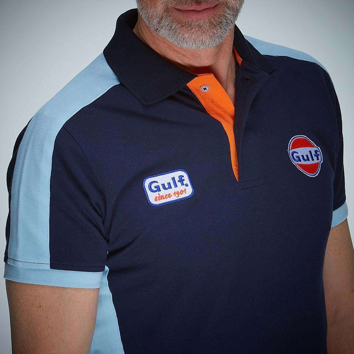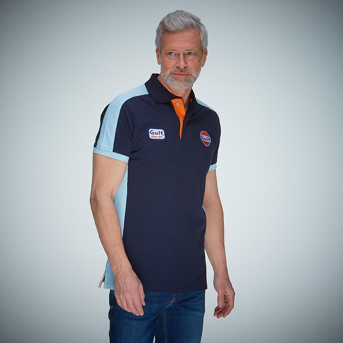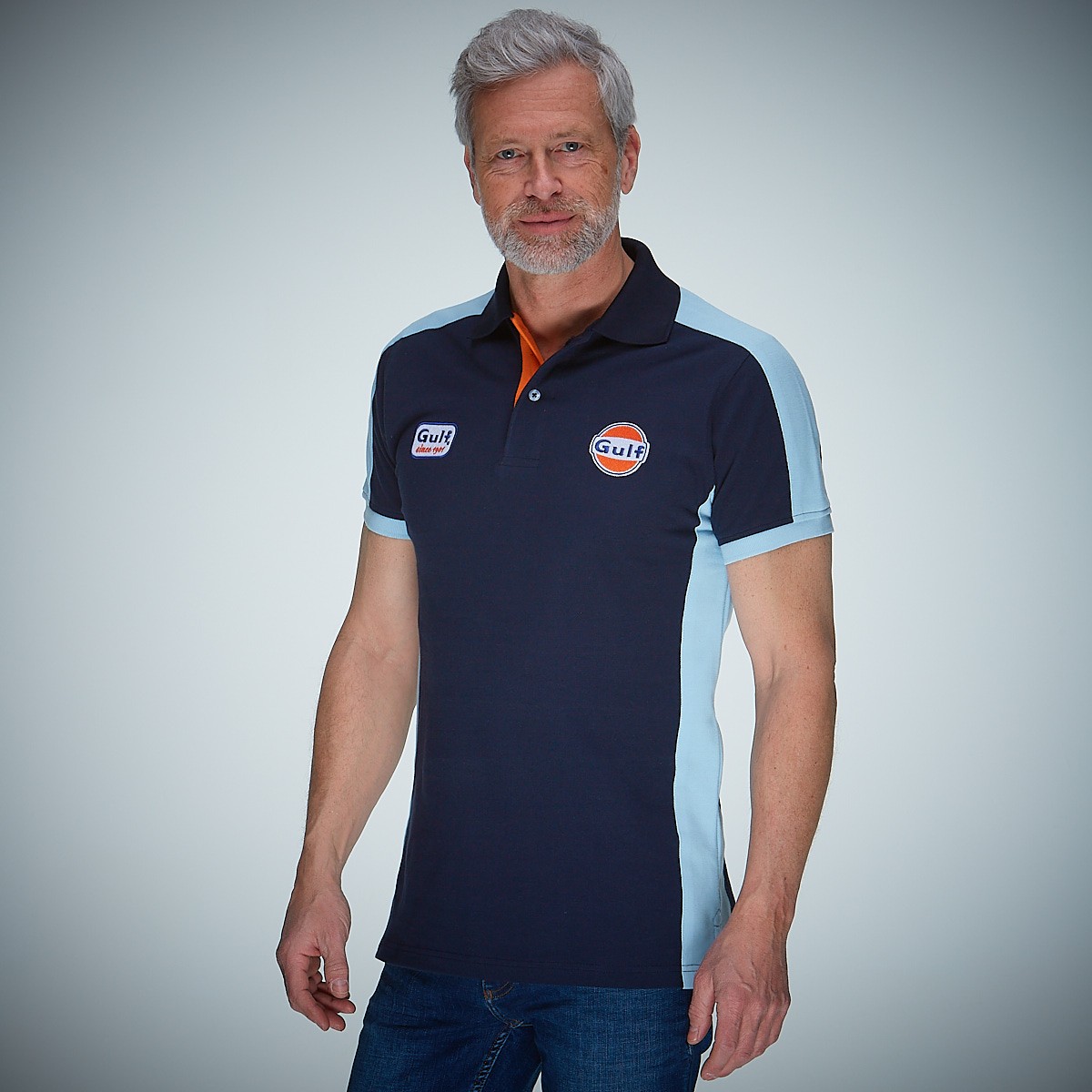Neues Gulf Polo Shirt Design von GPO im perfekten Retrolook. Marineblau mit gulfblauen Schulter-, Seiten- und Ärmeleinsätzen. Gulf-Logo gestickt sowie „Gulf since 1901“-Abzeichen auf der Brust. Die Knopfleiste in Orange rundet das Design perfekt ab! Reguläre Passform und auch in hellblau erhältlich.