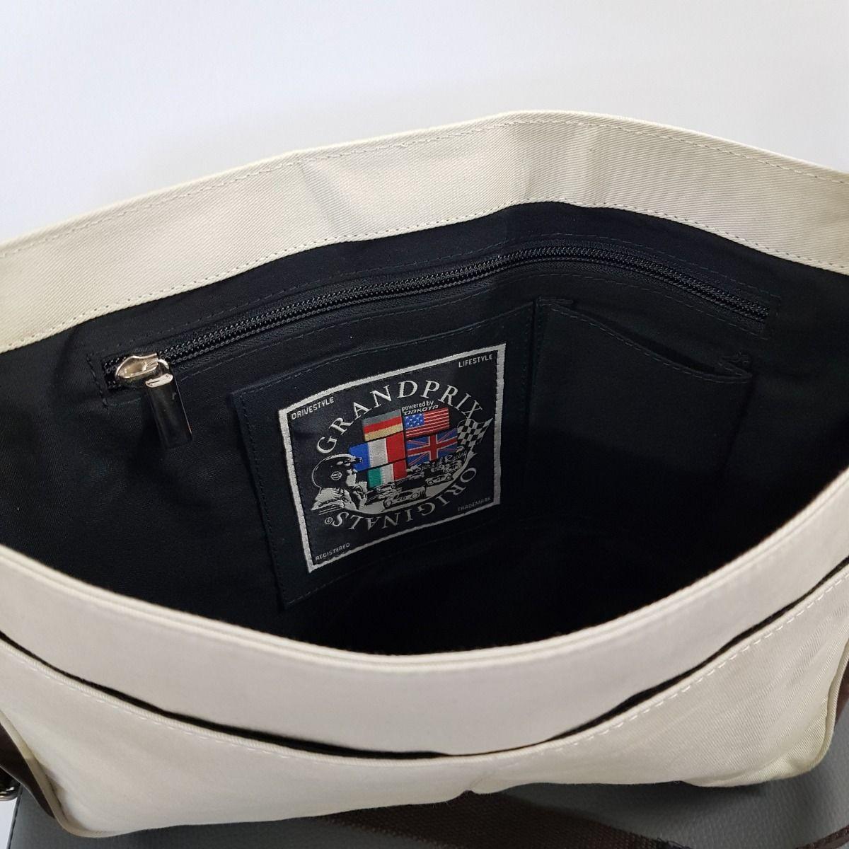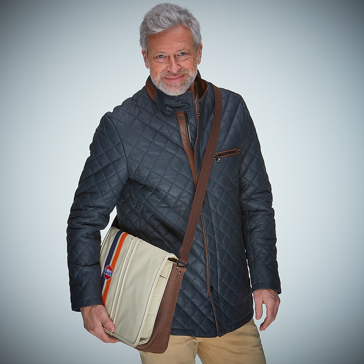 Stylische Umhängetasche aus Canvasstoff und braunem Vintageleder mit den Racingstreifen und dem historischen Gulf-Logo, abgeleitet vom Overall den Steve McQueen am Anfang der Dreharbeiten im Film Le Mans getragen hat. Sehr schöne Verarbeitung mit verschiedenen Innentaschen sowie integrierter Handytasche machen diese Messengerbag zu einem treuen und praktischen Begleiter nicht nur an der Rennstrecke. Eine tolle Investition in eine solide Tasche! In 2 weiteren Farben lieferbar.
