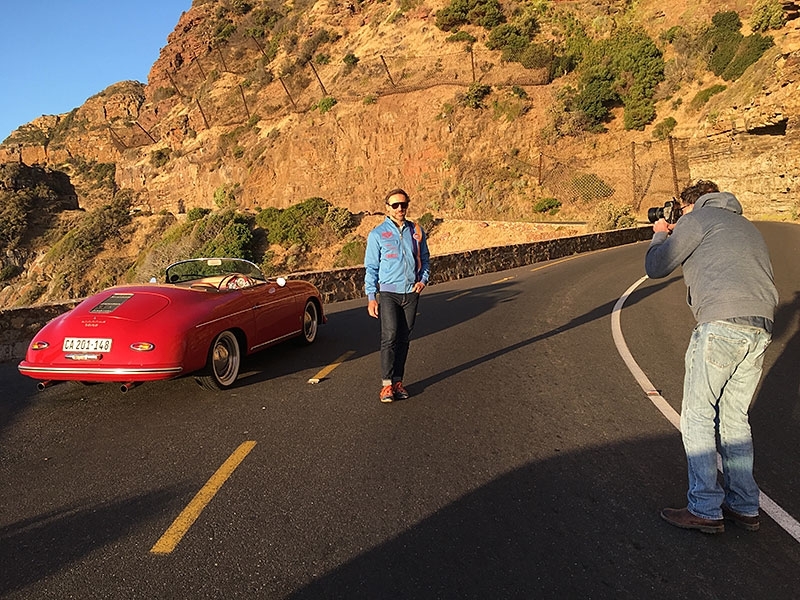 Der rote Porsche Speedster schlängelt sich den Chapman’s Peak Drive zwischen Noordhoek und Hout Bay entlang. Afrikas spektakulärste Küstenstraβe. Die Nachmittagsonne beleuchtet die Felsen. Sie sehen aus als würden sie von innen heraus glühen. Der kleine Porsche schwingt sich von rechts nach links. Bis er an einer der Parkbuchten anhält. Der Fahrer steigt aus und genieβt die grandiose Aussicht. Was für ein perfekter Abschluss zu einem Roadtrip ums Kap. Aber es war garnicht so einfach dieses Motiv hinzubekommen. Unser kleines Team startete am Morgen. In Woodstock. Heutzutage Kapstadts trendigster Stadtteil mit Dutzenden von Lifestyle Shops, Bistros, Cafés und Restaurants. Hier ist die bekennende Autofanatikerin Michelle dabei ein ehemaliges Lagerhaus auf drei Stockwerken zu renovieren. Irgendwann sollen einmal alle ihre Autos im Erdgeschoss parken. Unsere erste Foto-Location.